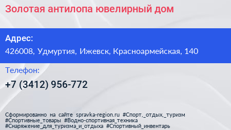 Золотая антилопа, ювелирный дом по адресу 426008, Удмуртия, Ижевск, Красноармейская, 140 в дальнейшем Организация, размещена в следующих категориях: