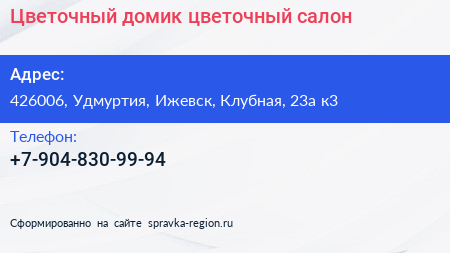 Цветочный домик, цветочный салон по адресу 426006, Удмуртия, Ижевск, Клубная, 23а к3 в дальнейшем Организация, размещена в следующих категориях: