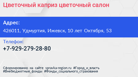 Цветочный каприз, цветочный салон по адресу 426011, Удмуртия, Ижевск, 10 лет Октября, 53 в дальнейшем Организация, размещена в следующих категориях: