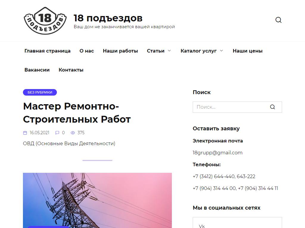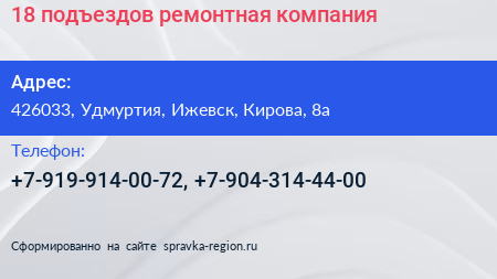 18 подъездов, ремонтная компания по адресу 426033, Удмуртия, Ижевск, Кирова, 8а в дальнейшем Организация, размещена в следующих категориях:
