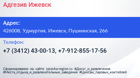Адгезив-Ижевск по адресу 426008, Удмуртия, Ижевск, Пушкинская, 266 в дальнейшем Организация, размещена в следующих категориях: