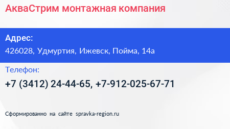 АкваСтрим, монтажная компания по адресу 426028, Удмуртия, Ижевск, Пойма, 14а в дальнейшем Организация, размещена в следующих категориях: