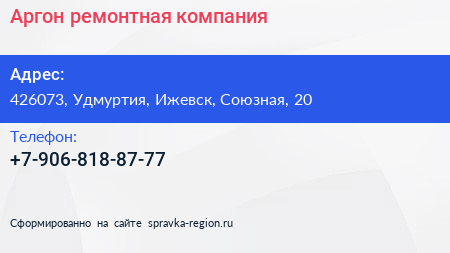Аргон, ремонтная компания по адресу 426073, Удмуртия, Ижевск, Союзная, 20 в дальнейшем Организация, размещена в следующих категориях: