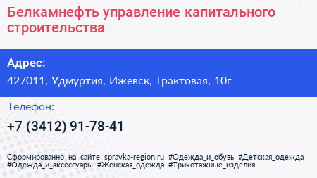Белкамнефть, управление капитального строительства по адресу 427011, Удмуртия, Ижевск, Трактовая, 10г в дальнейшем Организация, размещена в следующих категориях:
