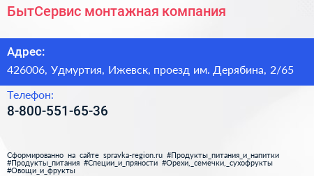 БытСервис, монтажная компания по адресу 426006, Удмуртия, Ижевск, проезд им. Дерябина, 2/65 в дальнейшем Организация, размещена в следующих категориях: