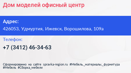 Дом моделей, офисный центр по адресу 426053, Удмуртия, Ижевск, Ворошилова, 109а в дальнейшем Организация, размещена в следующих категориях: