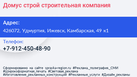 Домус-строй, строительная компания по адресу 426072, Удмуртия, Ижевск, Камбарская, 49 к1 в дальнейшем Организация, размещена в следующих категориях: