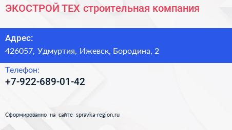 ЭКОСТРОЙ-ТЕХ, строительная компания по адресу 426057, Удмуртия, Ижевск, Бородина, 2 в дальнейшем Организация, размещена в следующих категориях: