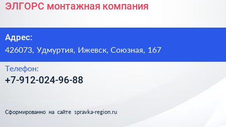 ЭЛГОРС, монтажная компания по адресу 426073, Удмуртия, Ижевск, Союзная, 167 в дальнейшем Организация, размещена в следующих категориях: