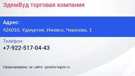 ЭдемВуд, торговая компания по адресу 426010, Удмуртия, Ижевск, Черезова, 1 в дальнейшем Организация, размещена в следующих категориях: