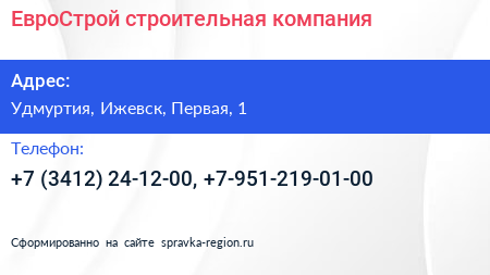 ЕвроСтрой, строительная компания по адресу Удмуртия, Ижевск, Первая, 1 в дальнейшем Организация, размещена в следующих категориях: