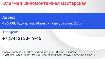 Флагман, шиномонтажная мастерская по адресу 426008, Удмуртия, Ижевск, Удмуртская, 255а в дальнейшем Организация, размещена в следующих категориях: