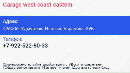 Garage-west coast castem по адресу 426006, Удмуртия, Ижевск, Баранова, 29Б в дальнейшем Организация, размещена в следующих категориях: