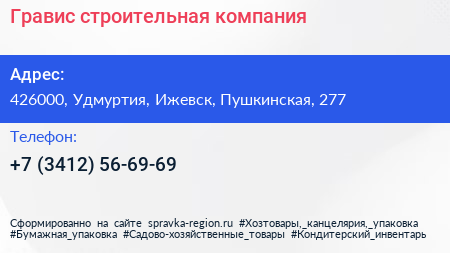Гравис, строительная компания по адресу 426000, Удмуртия, Ижевск, Пушкинская, 277 в дальнейшем Организация, размещена в следующих категориях: