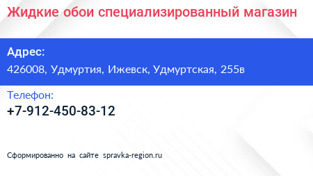 Жидкие обои, специализированный магазин по адресу 426008, Удмуртия, Ижевск, Удмуртская, 255в в дальнейшем Организация, размещена в следующих категориях: