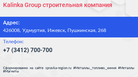 Kalinka Group, строительная компания по адресу 426008, Удмуртия, Ижевск, Пушкинская, 268 в дальнейшем Организация, размещена в следующих категориях: