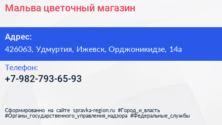 Мальва, цветочный магазин по адресу 426063, Удмуртия, Ижевск, Орджоникидзе, 14а в дальнейшем Организация, размещена в следующих категориях: