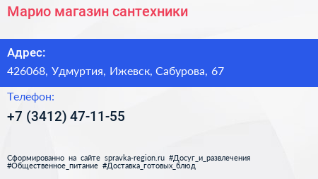 Марио, магазин сантехники по адресу 426068, Удмуртия, Ижевск, Сабурова, 67 в дальнейшем Организация, размещена в следующих категориях: