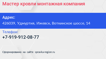 Мастер кровли, монтажная компания по адресу 426039, Удмуртия, Ижевск, Воткинское шоссе, 14 в дальнейшем Организация, размещена в следующих категориях: