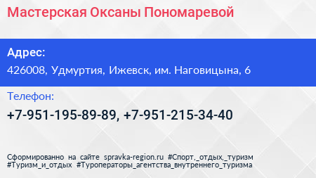 Мастерская Оксаны Пономаревой по адресу 426008, Удмуртия, Ижевск, им. Наговицына, 6 в дальнейшем Организация, размещена в следующих категориях: