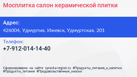 Мосплитка, салон керамической плитки по адресу 426004, Удмуртия, Ижевск, Удмуртская, 201 в дальнейшем Организация, размещена в следующих категориях: