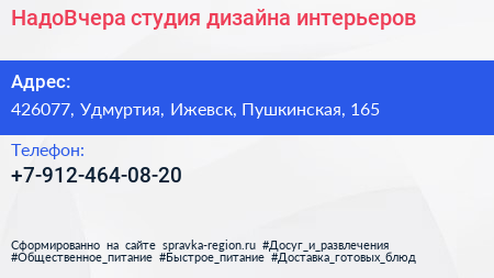 НадоВчера, студия дизайна интерьеров по адресу 426077, Удмуртия, Ижевск, Пушкинская, 165 в дальнейшем Организация, размещена в следующих категориях: