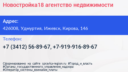 Новостройка18, агентство недвижимости по адресу 426008, Удмуртия, Ижевск, Кирова, 146 в дальнейшем Организация, размещена в следующих категориях: