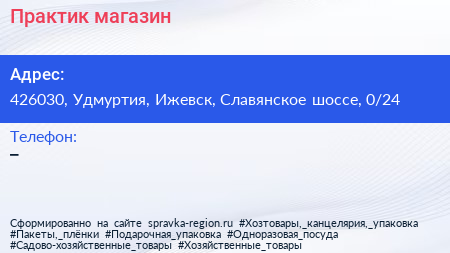 Практик, магазин по адресу 426030, Удмуртия, Ижевск, Славянское шоссе, 0/24 в дальнейшем Организация, размещена в следующих категориях: