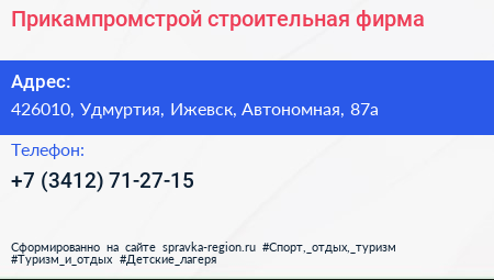 Прикампромстрой, строительная фирма по адресу 426010, Удмуртия, Ижевск, Автономная, 87а в дальнейшем Организация, размещена в следующих категориях: