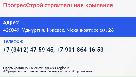ПрогресСтрой, строительная компания по адресу 426049, Удмуртия, Ижевск, Механизаторская, 26 в дальнейшем Организация, размещена в следующих категориях: