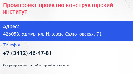 Промпроект, проектно-конструкторский институт по адресу 426053, Удмуртия, Ижевск, Салютовская, 71 в дальнейшем Организация, размещена в следующих категориях:
