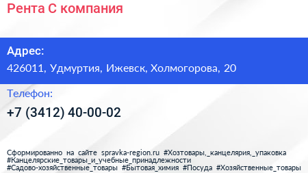 Рента-С, компания по адресу 426011, Удмуртия, Ижевск, Холмогорова, 20 в дальнейшем Организация, размещена в следующих категориях:
