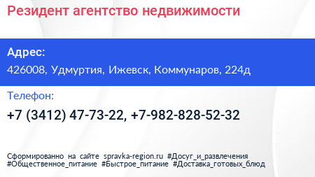 Резидент, агентство недвижимости по адресу 426008, Удмуртия, Ижевск, Коммунаров, 224д в дальнейшем Организация, размещена в следующих категориях: