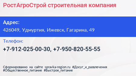 РостАгроСтрой, строительная компания по адресу 426049, Удмуртия, Ижевск, Гагарина, 49 в дальнейшем Организация, размещена в следующих категориях: