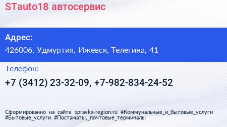 STauto18, автосервис по адресу 426006, Удмуртия, Ижевск, Телегина, 41 в дальнейшем Организация, размещена в следующих категориях: