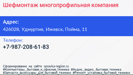 Шефмонтаж, многопрофильная компания по адресу 426028, Удмуртия, Ижевск, Пойма, 11 в дальнейшем Организация, размещена в следующих категориях: