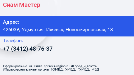 Сиам Мастер по адресу 426039, Удмуртия, Ижевск, Новосмирновская, 18 в дальнейшем Организация, размещена в следующих категориях: