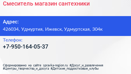 Смеситель, магазин сантехники по адресу 426034, Удмуртия, Ижевск, Удмуртская, 304к в дальнейшем Организация, размещена в следующих категориях: