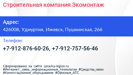 Строительная компания Экомонтаж по адресу 426008, Удмуртия, Ижевск, Пушкинская, 266 в дальнейшем Организация, размещена в следующих категориях: