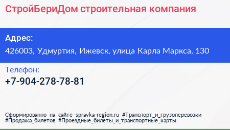 СтройБериДом, строительная компания по адресу 426003, Удмуртия, Ижевск, улица Карла Маркса, 130 в дальнейшем Организация, размещена в следующих категориях:
