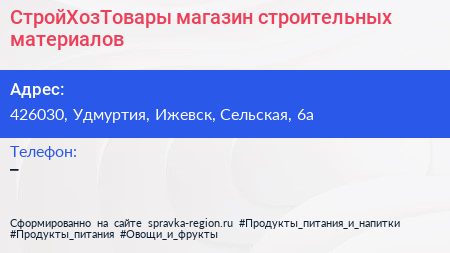 СтройХозТовары, магазин строительных материалов по адресу 426030, Удмуртия, Ижевск, Сельская, 6а в дальнейшем Организация, размещена в следующих категориях: