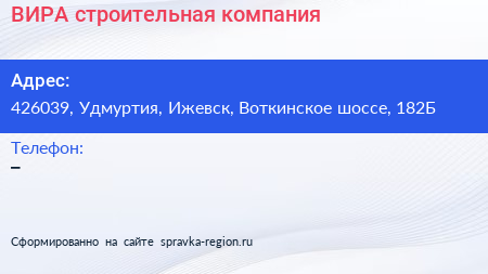 ВИРА, строительная компания по адресу 426039, Удмуртия, Ижевск, Воткинское шоссе, 182Б в дальнейшем Организация, размещена в следующих категориях: