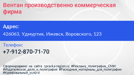 Вентан, производственно-коммерческая фирма по адресу 426063, Удмуртия, Ижевск, Воровского, 123 в дальнейшем Организация, размещена в следующих категориях: