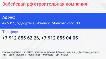 Забейсваи.рф, строительная компания по адресу 426011, Удмуртия, Ижевск, Маяковского, 11 в дальнейшем Организация, размещена в следующих категориях: