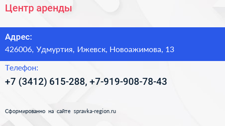 Центр аренды по адресу 426006, Удмуртия, Ижевск, Новоажимова, 13 в дальнейшем Организация, размещена в следующих категориях: