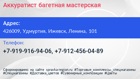 Аккуратист, багетная мастерская по адресу 426009, Удмуртия, Ижевск, Ленина, 101 в дальнейшем Организация, размещена в следующих категориях: