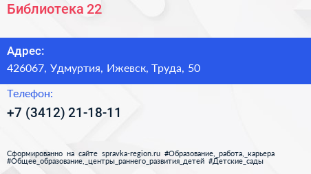 Библиотека №22 по адресу 426067, Удмуртия, Ижевск, Труда, 50 в дальнейшем Организация, размещена в следующих категориях:
