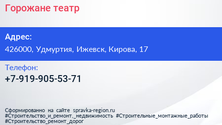 Горожане, театр по адресу 426000, Удмуртия, Ижевск, Кирова, 17 в дальнейшем Организация, размещена в следующих категориях: