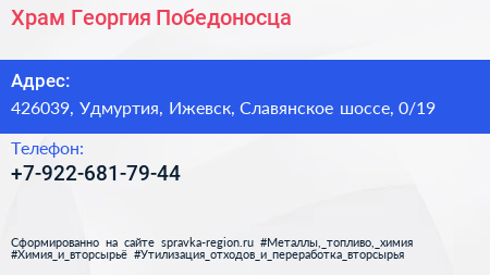 Храм Георгия Победоносца по адресу 426039, Удмуртия, Ижевск, Славянское шоссе, 0/19 в дальнейшем Организация, размещена в следующих категориях: