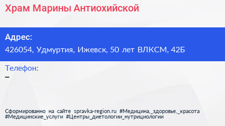Храм Марины Антиохийской по адресу 426054, Удмуртия, Ижевск, 50 лет ВЛКСМ, 42Б в дальнейшем Организация, размещена в следующих категориях: